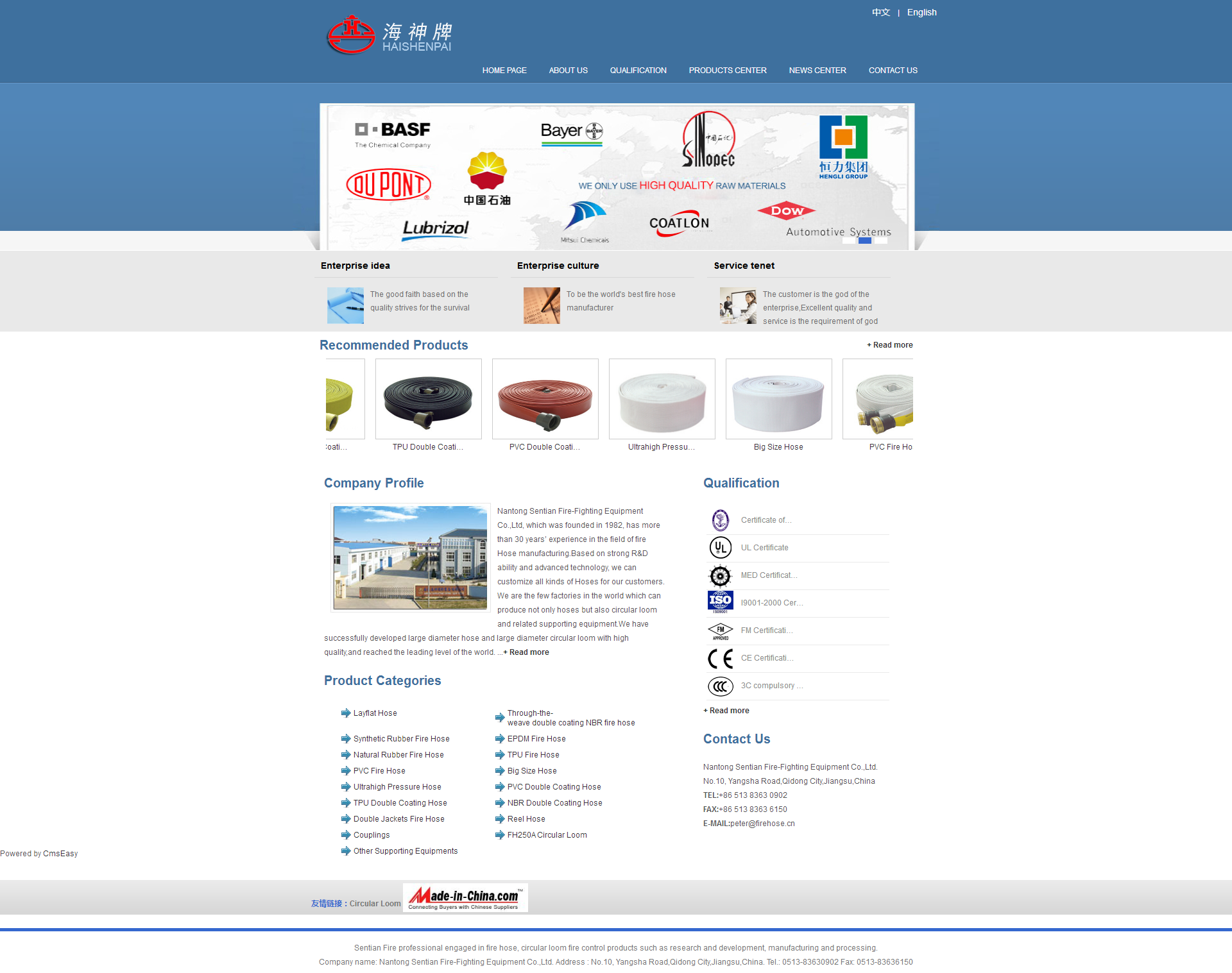 森田公司成立于1982年,有著30多年的水帶生產經驗;公司研發能力強,能夠根據客戶要求生產各種水帶.公司是世界上水帶行業中為數不多的,既能生產水帶,又能生產圓織機及相關配套設備的廠家.我們成功研發的大口徑軟管和大口徑圓織機達到先進水平.公司產品通過了CCC,CCS,CE,MED,FM,UL等認證.產...